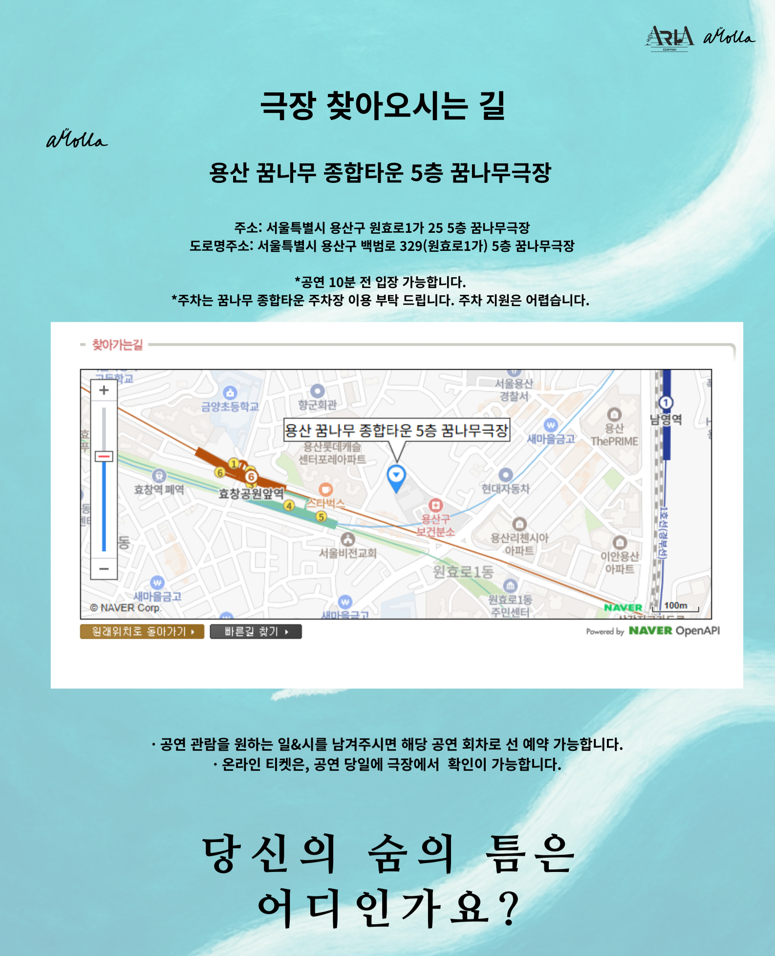 | 내용 | 일시 : 2025. 10. 11 ~ 10. 12 14시 장소 : 용산 꿈나무 종합타운 5층 꿈나무 극장 용산구시설관리공단 x 예술로 < 아 몰라 프로젝트 > 는, 무기력과 의욕 상실 속 에서도 어쩐지 무엇인가를 시작하게 되는 순간 에 대해 말합니다. "아ㅡ, 몰라!"는 포기가 아니라 그럼에도 불구하고 나아가는 우리만의 방식이자 유쾌한 생존 전략입니다. 시작 그 자체의 힘을 무대위에서 펼쳐내는 작업을 진행합니다. 위로가 필요한 누군가의 세상으로, 이대로도 괜찮은 우리의 과정을 보듬고 응원합니다. 작품소개 정체성의 혼란을 겪는 선민 쉼을 갈망하는 지연 흩어진 조각을 맞춰나가는 채린 세상에 미련 둘 것을 찾고 있는 수아 두 발을 땅에 심어보는 혜인 인생에 가장 푸르른 나날에 혹독한 성장통을 겪고있는 뜨거운 나, 너, 우리. 숨 쉴 틈을 찾아 치열하게 연대하는 청춘의 이야기. /시들어 버린 맘을 끌어안는 마음으로 다시 태어나게 해 주세요. 다시 태여나게 해 주세요. /좋아하는 것을 좋아하세요 이렇게 자꾸 세상에 미련을 두다보면 언젠가는 오늘이, 그렇게 내일이 좋아질지도 모르니까요. / 살다보면 그렇게 흐르지.