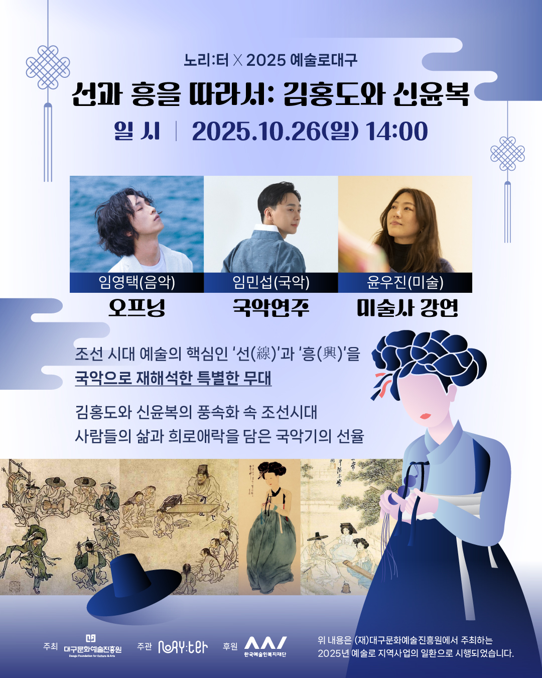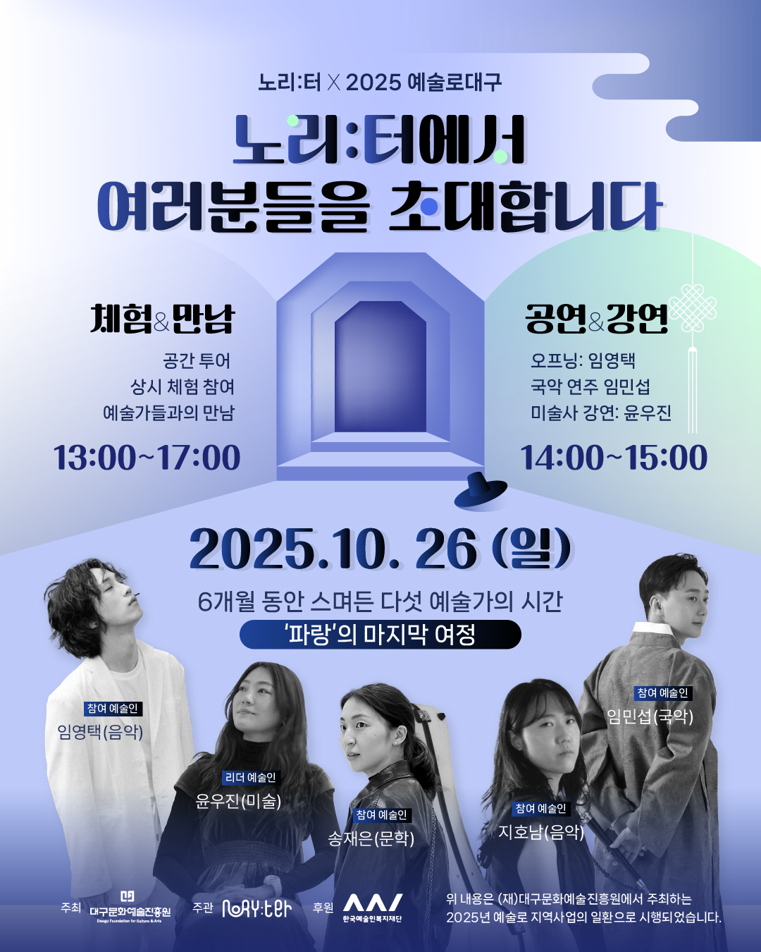| 내용 | 노리:터 X 2025 예술로 대구 ● 노리터 투어: 파랑을 찾아서' ● 선과 흥을 따라서: 김홍도와 신윤복 '파랑'의 마지막 여정으로 여러분을 초대합니다! 깊어가는 가을, 여섯 달의 열정이 피어난 자리, '2025 예술로 대구'의 마지막 여정이 오는 10월 26일, 노리터에서 펼쳐집니다. 지난 6개월간 '노리터' 공간에 스며들어 고유한 예술 세계를 구축해온 다섯 예술가의 이야기가 '파랑'의 이름으로 무대와 공간을 가득 채울 예정입니다. 예술가와의 진솔한 만남부터, 체험 프로그램, 그리고 감동적인 공연까지. 문자와 이미지, 아름다운 선율로 이어진 예술의 결정적인 순간들을 여러분의 감각으로 직접 느껴보세요. 오후2시 조금은 나른한 시간, 조선시대 예술의 핵심인 김홍도와 신윤복의 선과 흥을 따라서 미술사 강연과 국악 공연도 있으니 많은 관심 부탁드립니다. 예술가들의 숨결이 깃든 이 특별한 마지막 여정에 함께하시어 잊지 못할 가을날의 추억을 만들어 가시기를 바랍니다. 🔹️리더예술인 - 윤우진(미술) @artistywj 🔹️참여예술인 - 지호남(음악) @honam.ji - 임영택(음악) @moker4824 - 임민섭(음악) @ssub_jjang - 송재은(문학) @slow2nough 🗓 2025.10.26 (일) ⏰️ 13:00-17:00 📍 대구 중구 달구벌대로 2095, 삼성생명빌딩 B1 노리:터 주최_대구문화예술진흥원 @dca_gram 주관_노리터 @noryter 후원_한국예술인복지재단 @kawf_campaign 위 내용은 (재)대구문화예술진흥원에서 주최하는 2025년 예술로 지역사업의 일환으로 시행되었습니다. #노리터 #예술로대구 #예술인파견지원사업