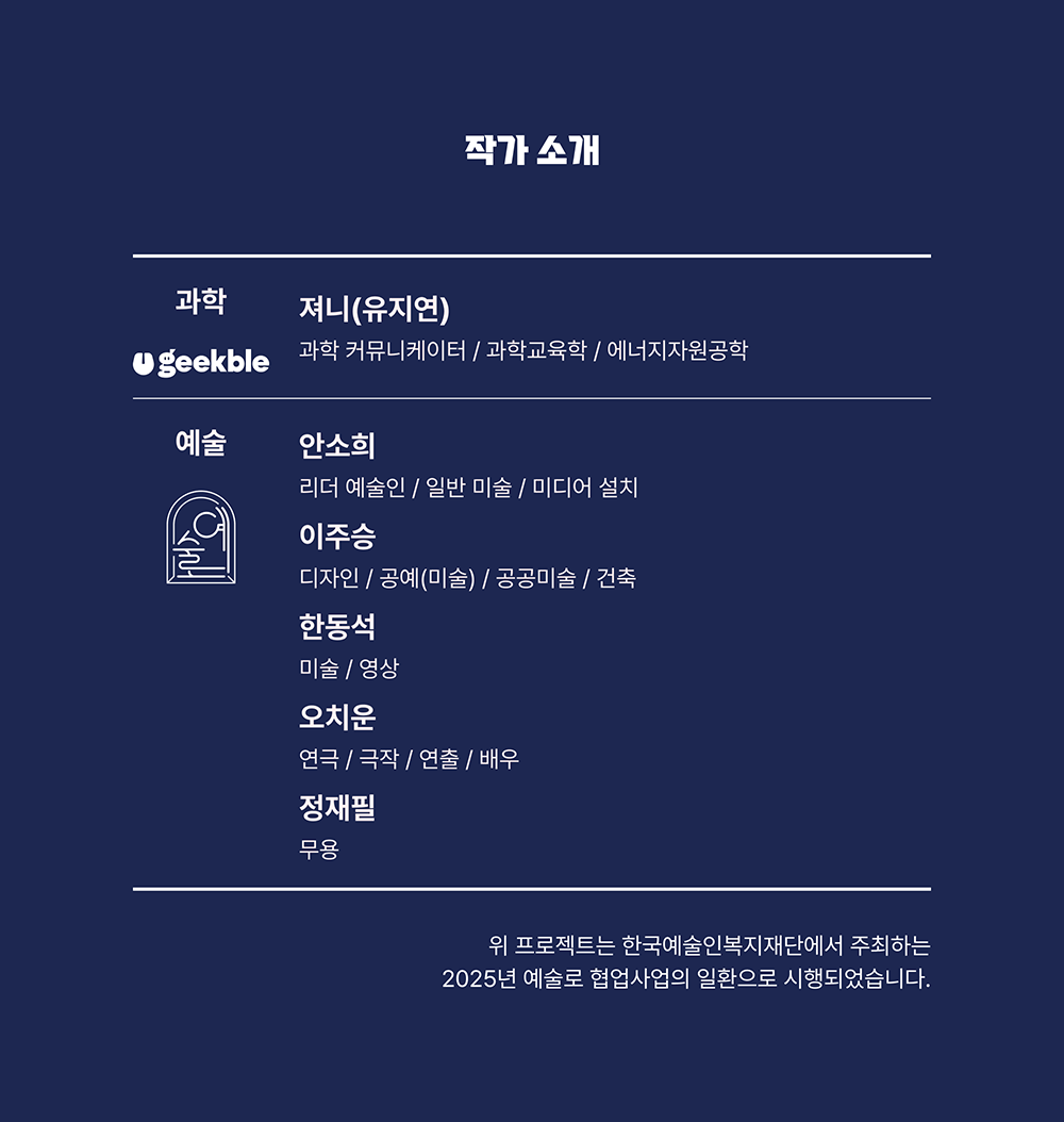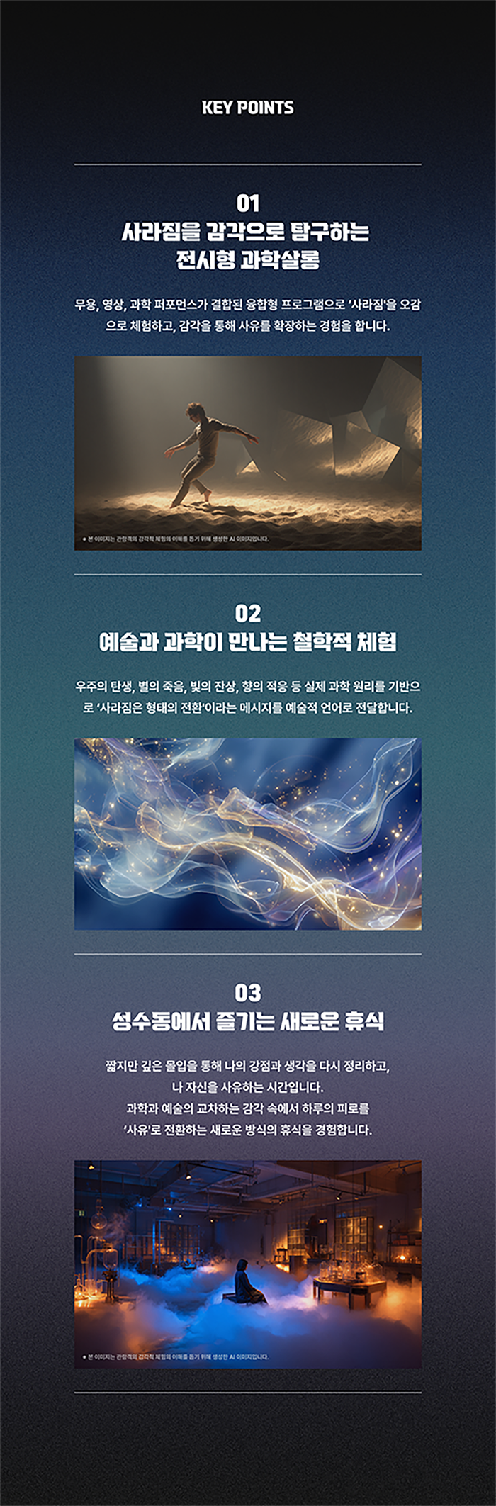 | 내용 | 예술로 협업사업 참여기업 긱블 X 예술인이 만나 전시형 과학살롱을 준비했습니다. 예술과 과학이 만나는 철학적 체험으로 무용, 영상, 과학 퍼포먼스가 결합된 융합형 프로그램으로 '사라짐'을 체험하고 감각을 통해 사유를 확장하는 경험을 긱블에서 함께하세요. 이 행사는 긱블 홈페이지에서 사전 등록 및 회차별 잔여석 있을 시 현장 신청 참여 가능합니다. 행사 참여 신청 및 자세한 내용은 아래 링크를 참고해주세요. https://edu.geekble.com/shop_view?idx=186